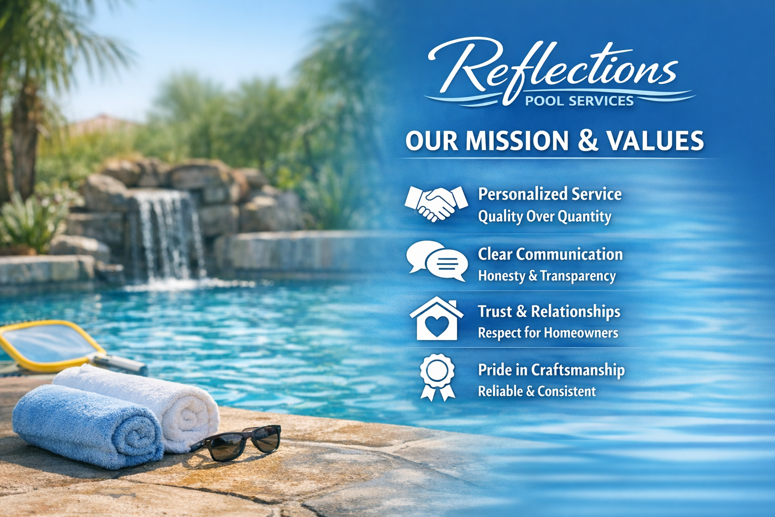 When you call Reflections Pool Services, you know exactly who will be showing up at your pool each week—and I take pride in doing the job right.